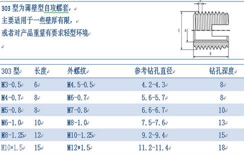 24h咨询热线13069364703 薄壁型绵阳自攻螺套外观上看主要有两种区分,一种是一端开槽型的,另一种是一端三圆孔型的,其中开圆孔型的又分为307型和308型两种,307型和308型外观主要区别就是同一直径下,长度和外径大小有所区分。以上各种型式螺套均具有自行攻牙功能。